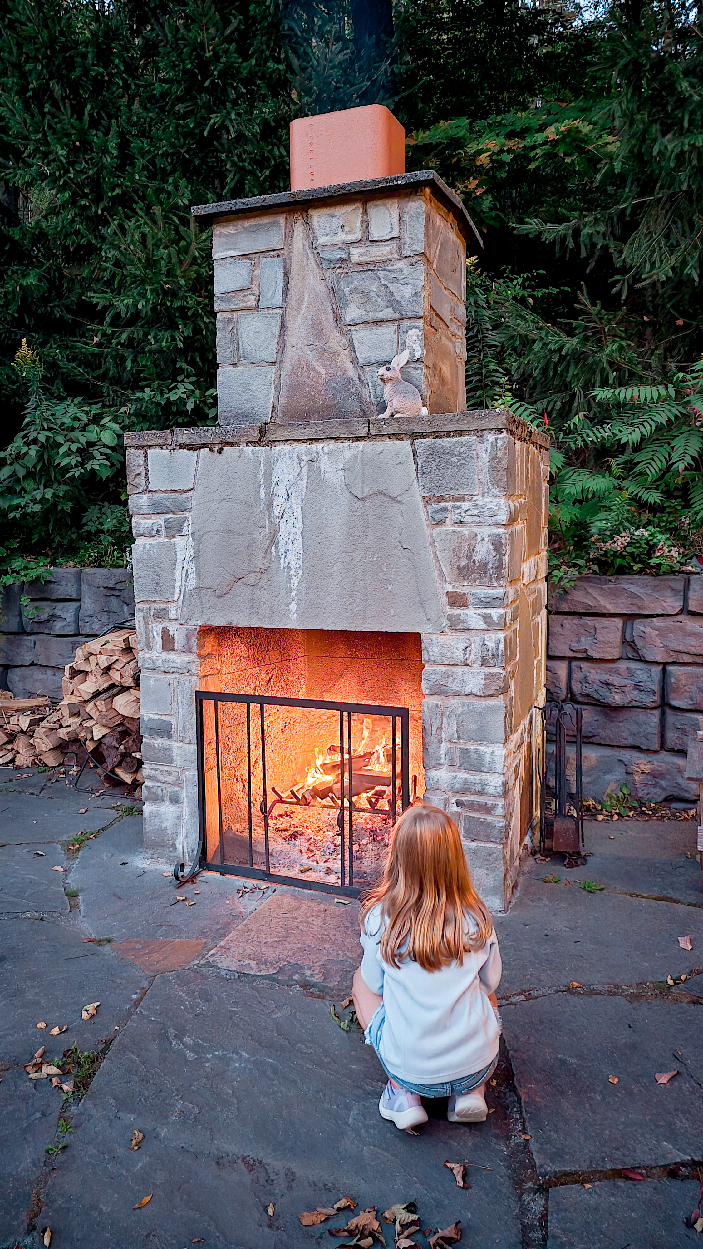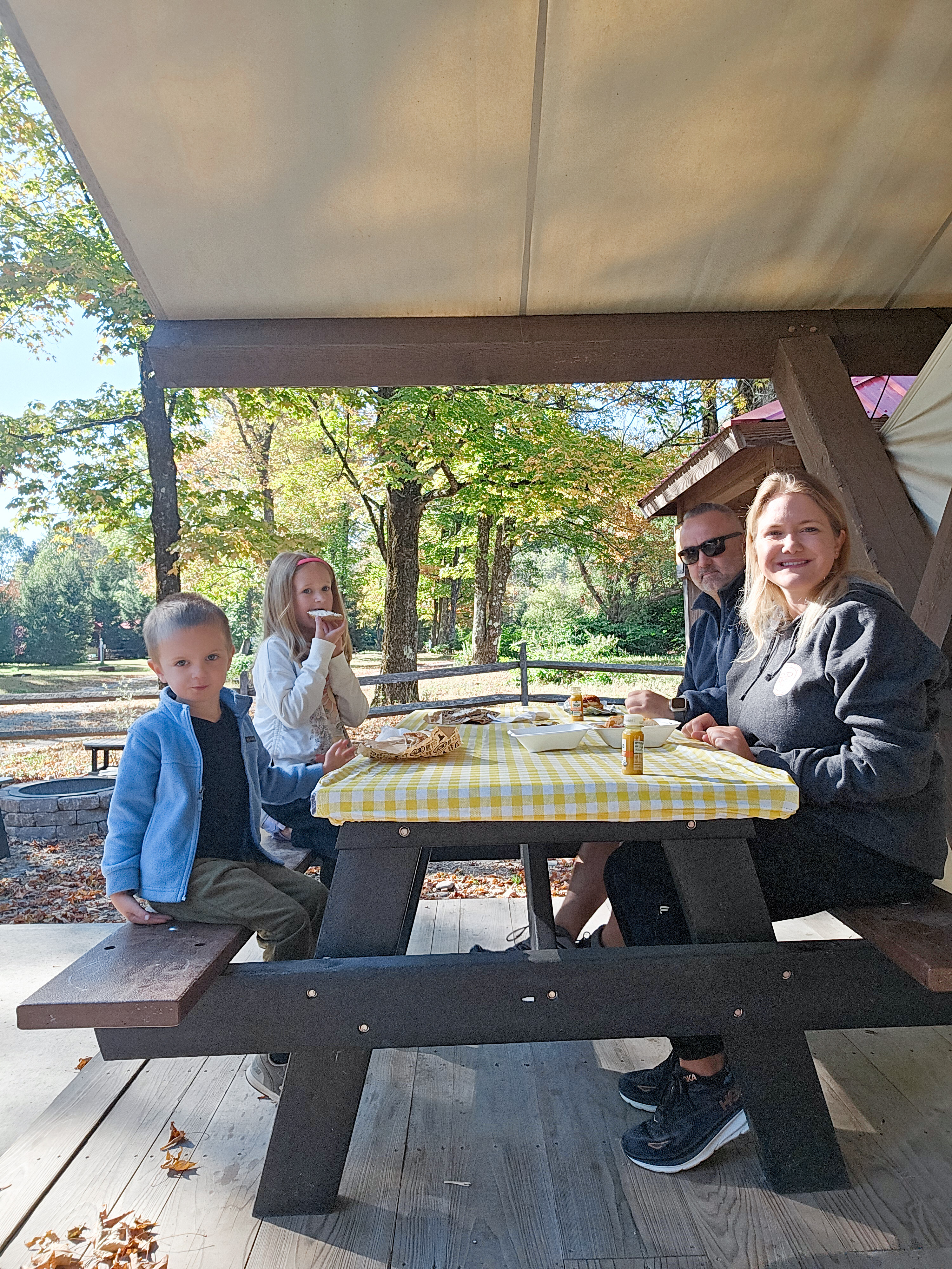 The tent came with a full bathroom (yes, a clawfoot tub in the woods!) and a shower, which made things so easy with kids. Outside, we had a picnic table, a grill under a gazebo, and even a cozy egg chair on the patio where we enjoyed slow breakfasts and lunches together. At night, the space transformed into our own little sanctuary under the stars.