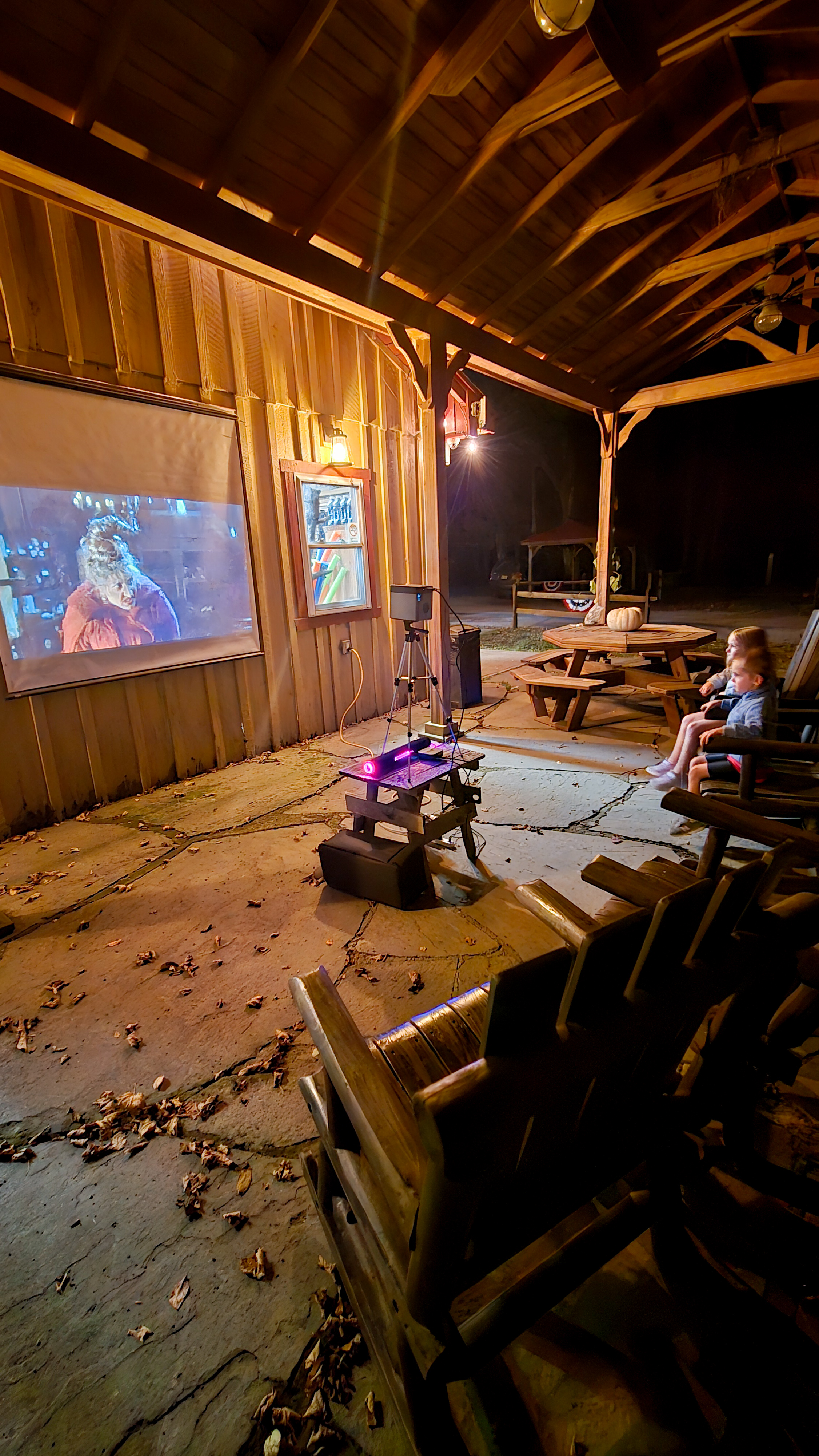 The moment we arrived, the weekend kicked off with one of my favorite camping traditions: roasting s’mores around the fire. Emilia and Nicholas were in heaven toasting marshmallows, sticky fingers and all. As the sun set, the whole campsite gathered to watch Hocus Pocus on the big screen—pure Halloween season vibes. It was the perfect way to start our getaway.