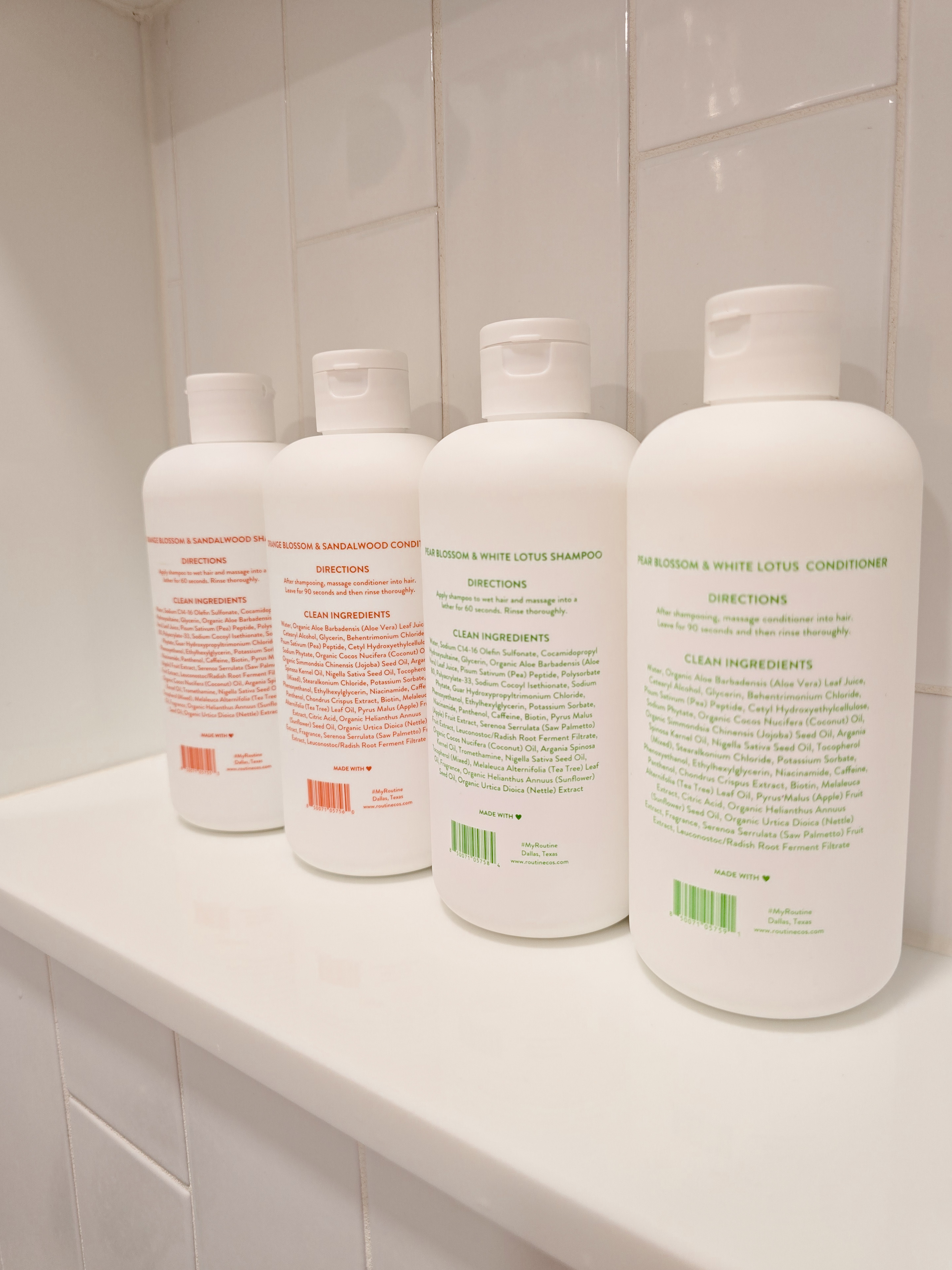 The first products I started with were the Routine Wellness Shampoo & Conditioner Set. This set is formulated specifically for thinning and fragile hair, blending ingredients like biotin, argan oil, saw palmetto, naturally derived plant extracts, and caffeine to help cleanse, nourish, and fortify hair while you wash. The formulas are sulfate‑free and safe for color‑treated hair, which was a huge plus for me as someone who loves lighter hair tones. They’re kid-safe too, which makes them perfect for families. One shampoo and conditioner set can easily be shared by everyone. There are also so many different scents to choose from, including limited-edition options like the Orange Blossom & Sandalwood and Pear Blossom & White Lotus winter scents that I had the pleasure of experiencing.