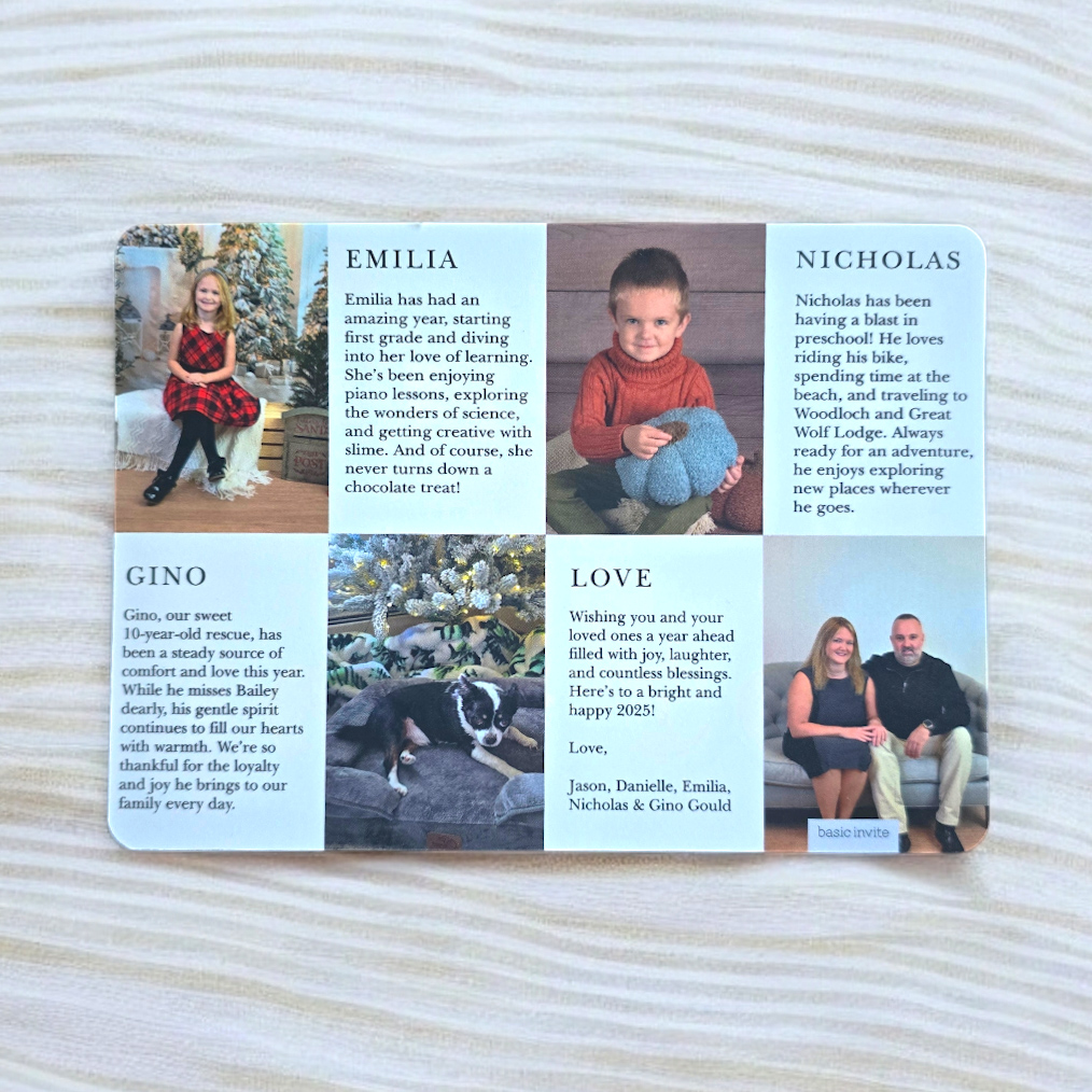 This year, we added a mini “year in review” on the back of the card. It included a short update on each family member which is something personal, something fun, and something memorable. It turned our card into more of a keepsake than a greeting.